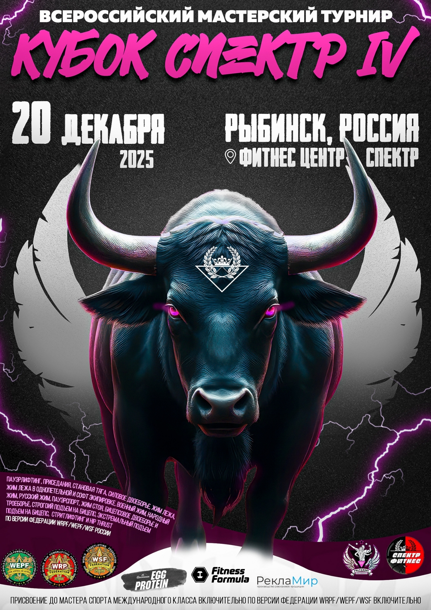 Всероссийский мастерский турнир «Кубок Спектр IV» по пауэрлифтингу, силовому двоеборью, приседаниям, жиму лежа, жимовому двоеборью, военному жиму, народному жиму, русскому жиму, становой тяге, пауэрспорту, жиму стоя, бицепсовому троеборью и двоеборью, подъему на бицепс, стритлифтингу и hip thrust по версии WRPF/WEPF/WSF, Россия / Ярославская область, Рыбинск, 20.12.2025 (присвоение до МСМК включительно)